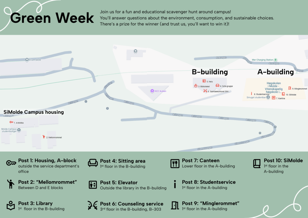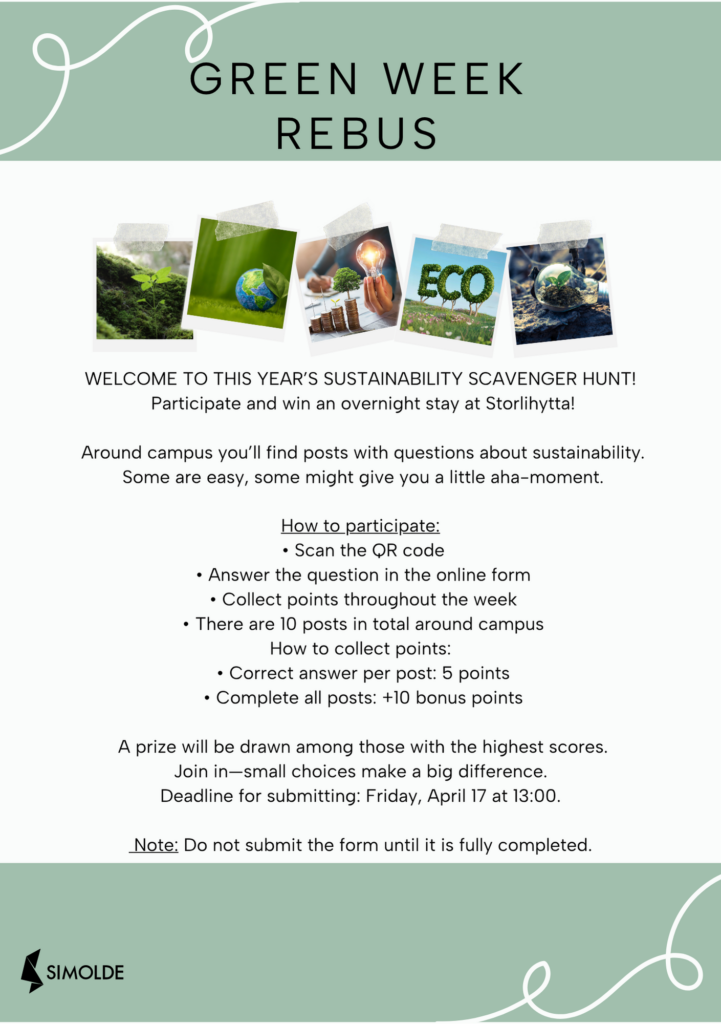 SiMolde is putting sustainability on the agenda and invites you, as a student, to take part. Green Week takes place throughout week 16, and our goal is to create engagement, awareness, and concrete opportunities for staff and students to make greener choices in their daily lives. Green Week is not just about the environment; it’s about community, creativity, and making small, practical changes that together make a big difference.